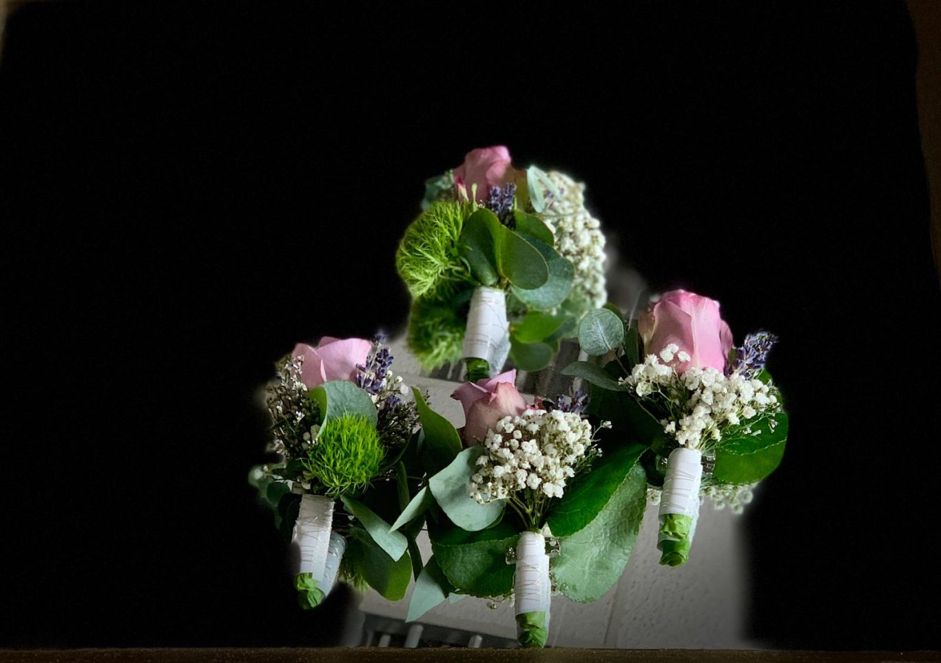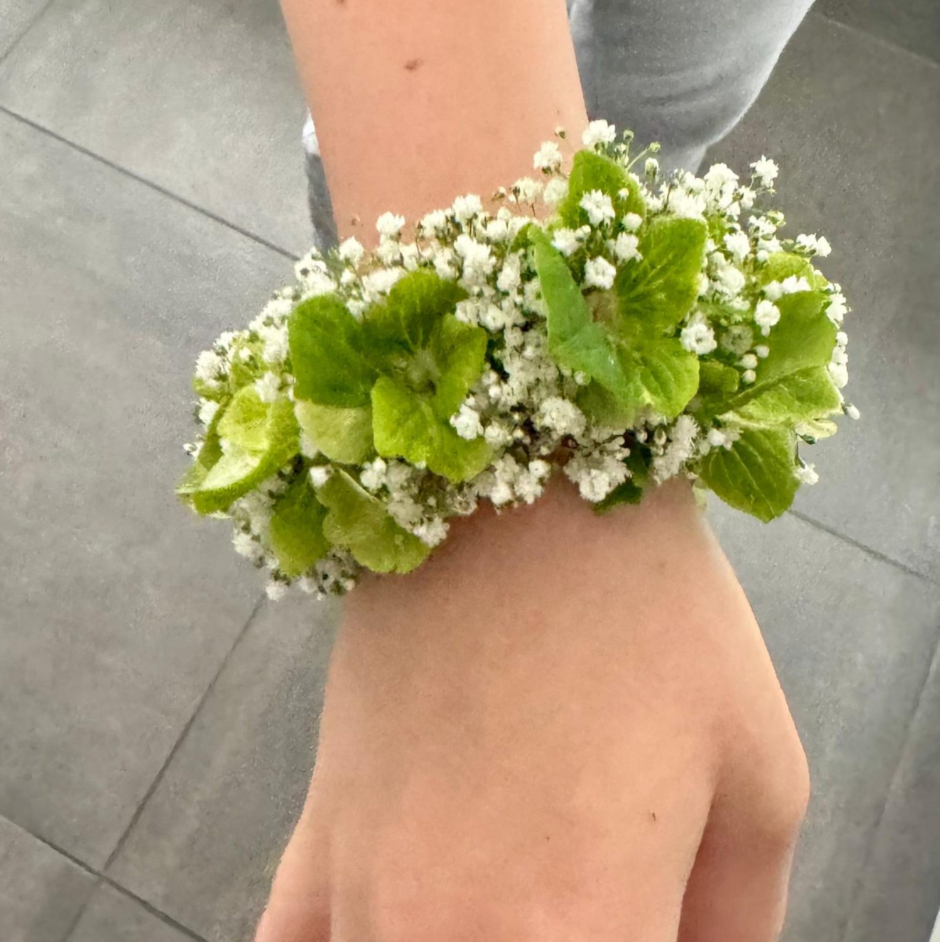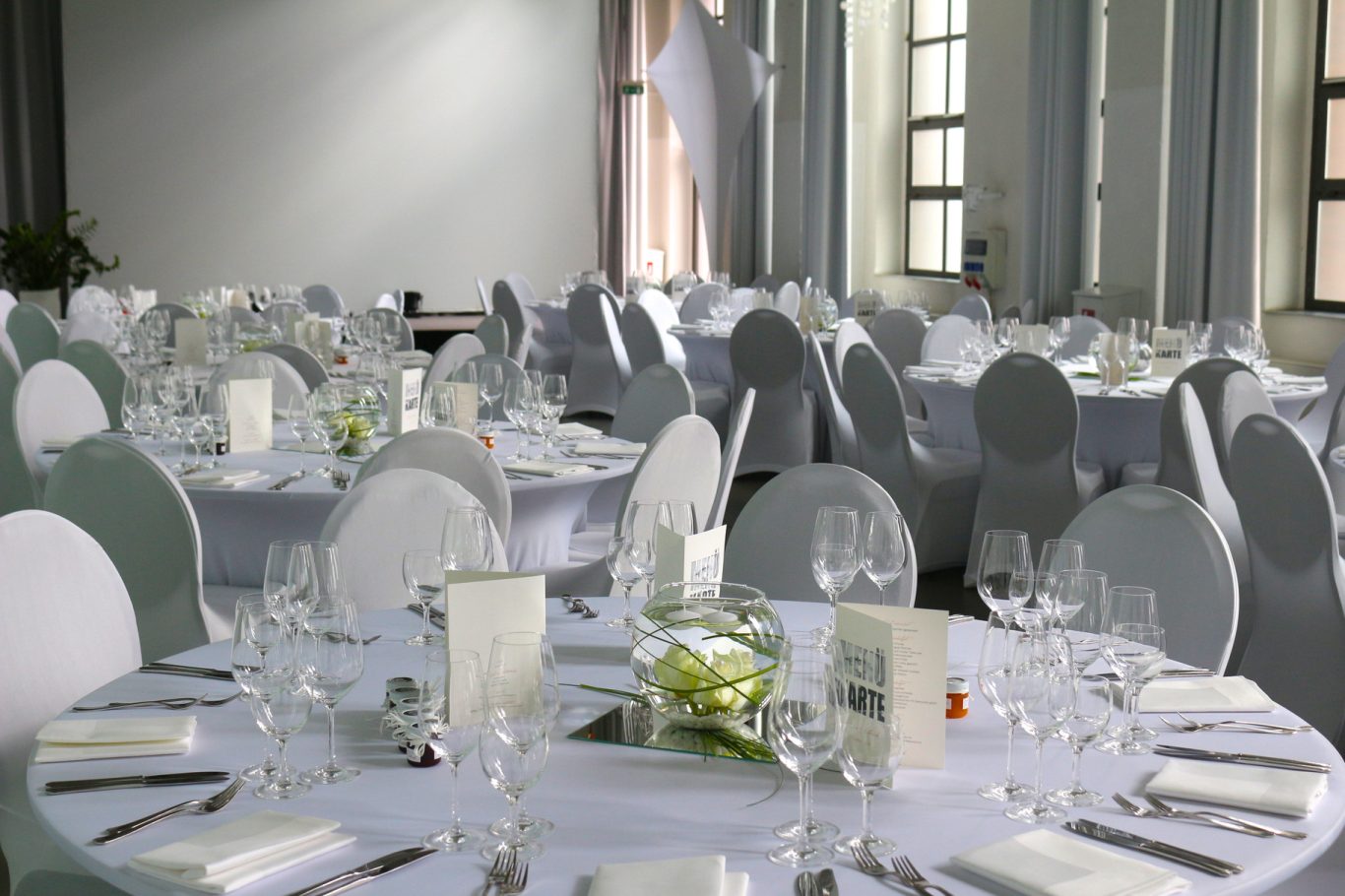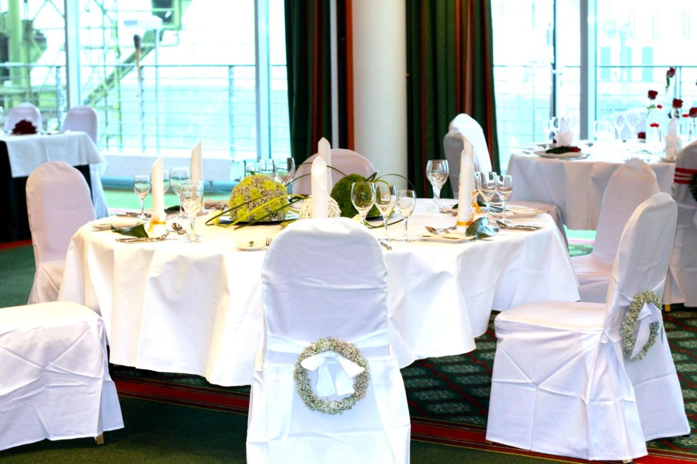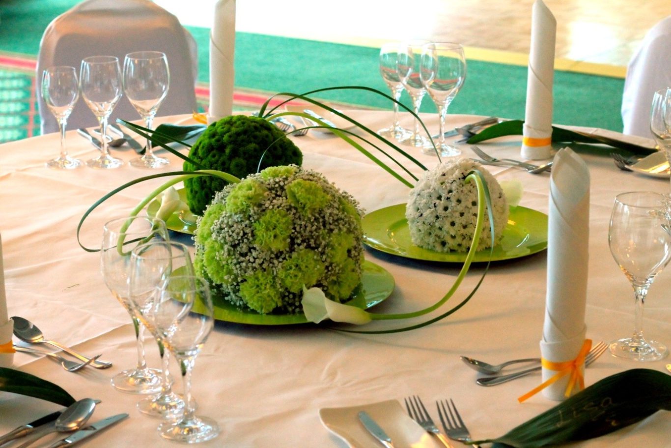 Im Mittelpunkt: Blütenkugeln in leuchtend frischen Farben, kunstvoll gesteckt mit grünen Nelken, Schleierkraut sowie grünen und weißen Santini. Die Verbindung zwischen den Elementen schufen elegante weiße Calla und feine Typha-Gräser – ein spannender Mix aus Natur und Design.