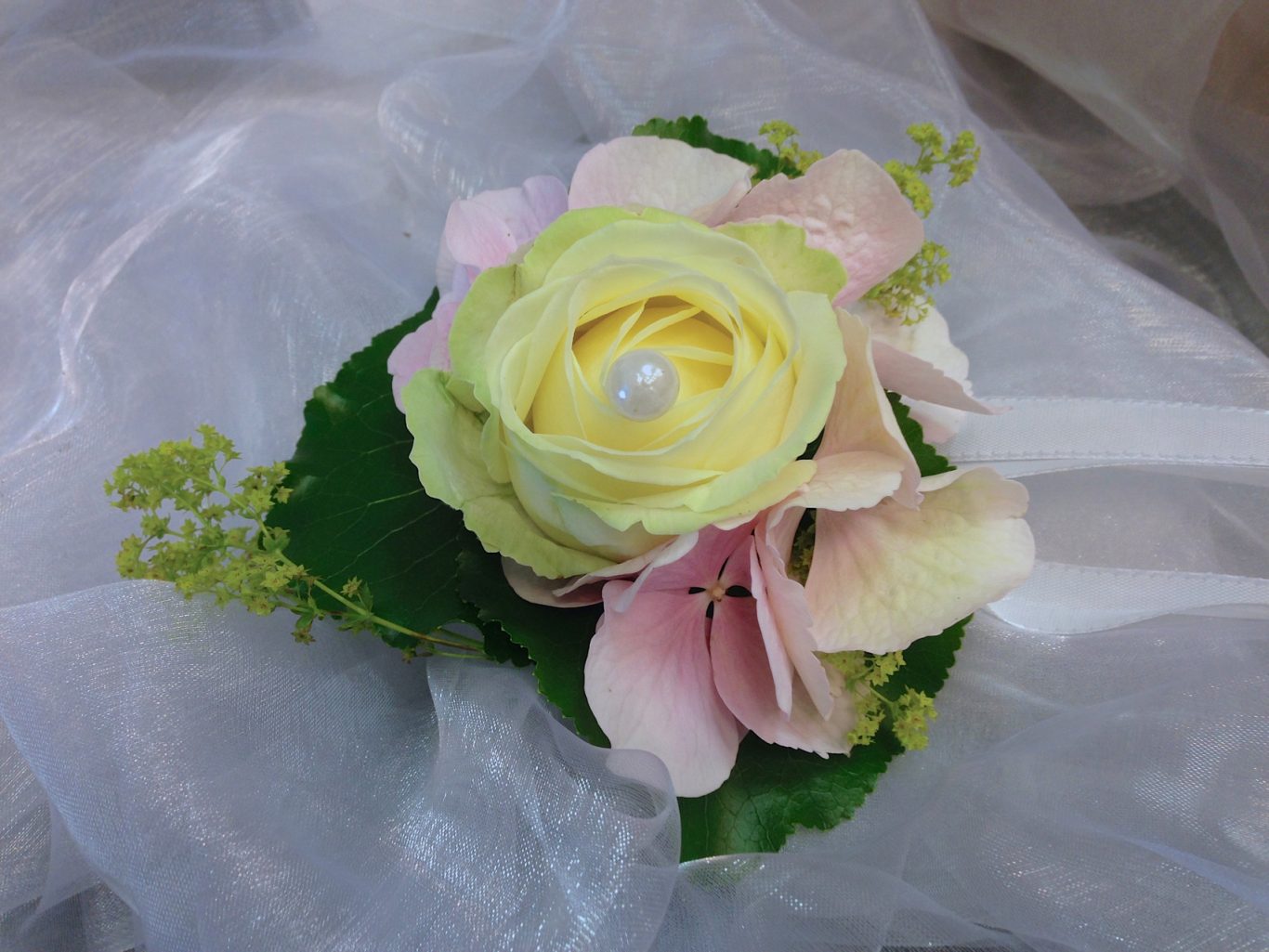 Im Mittelpunkt: rosafarbene Rosensorte „Deep Water“, kombiniert mit zarten Perlen, Alchemilla und liebevoll ausgewähltem Beiwerk. Der Brautstrauß war eine stilvolle Komposition aus Eleganz und Leichtigkeit – abgestimmt auf die gesamte Dekoration.