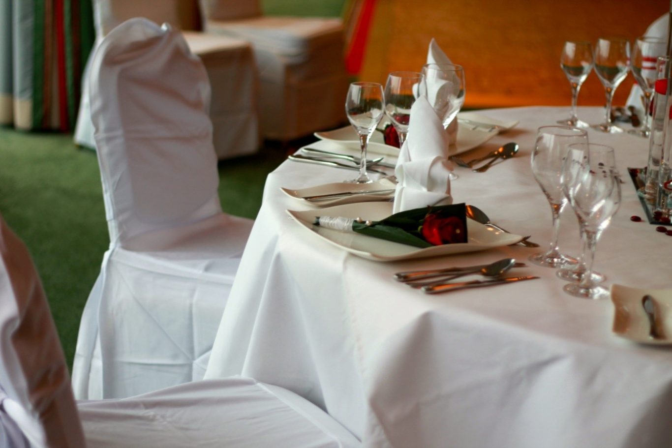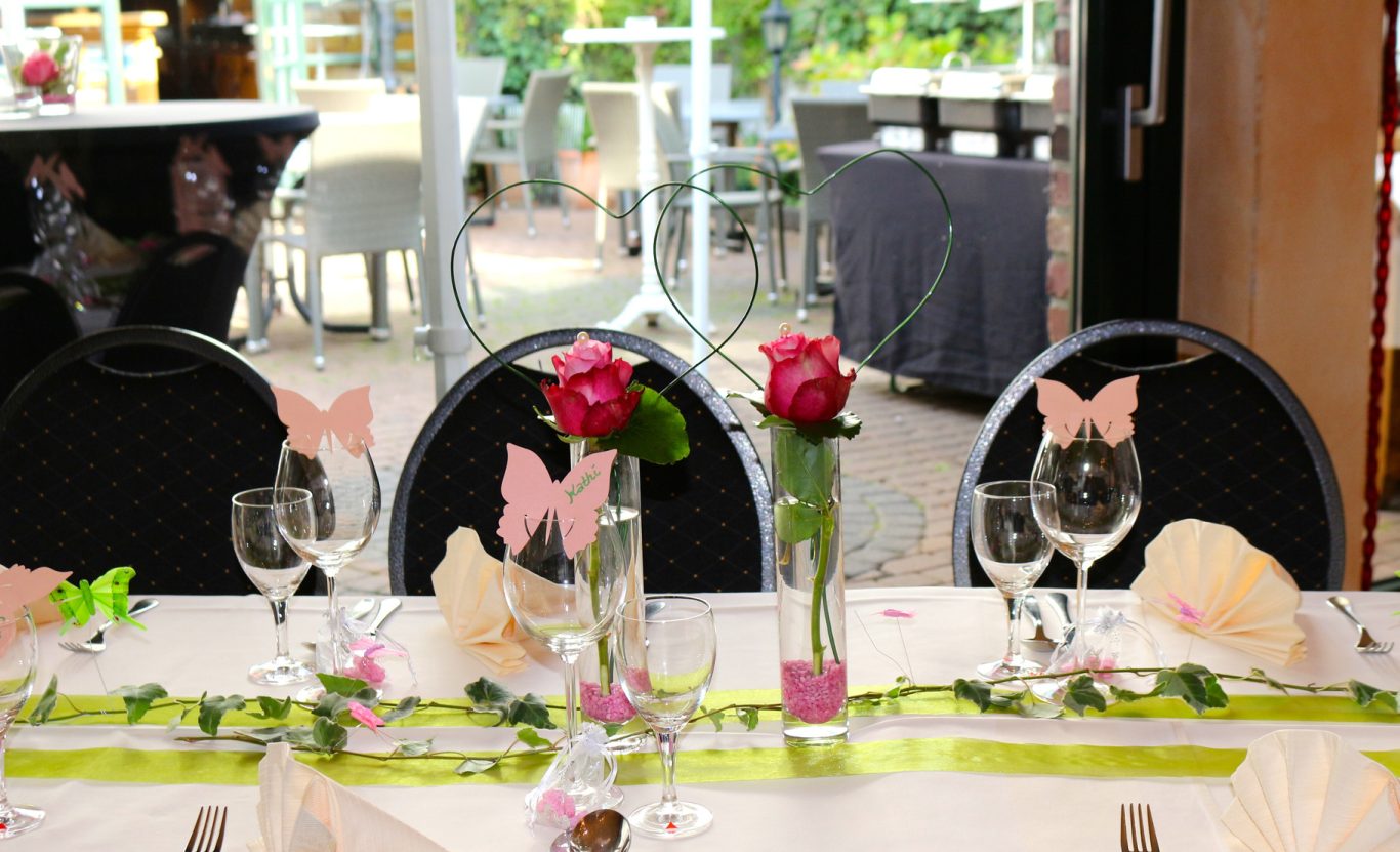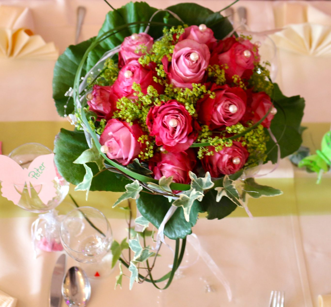 Die kräftigen Rottöne der Rosen, veredelt mit schimmernden Perlen, zierten als eleganter Tellerservice-Blumenschmuck jeden Gästetisch und setzten romantische Akzente.