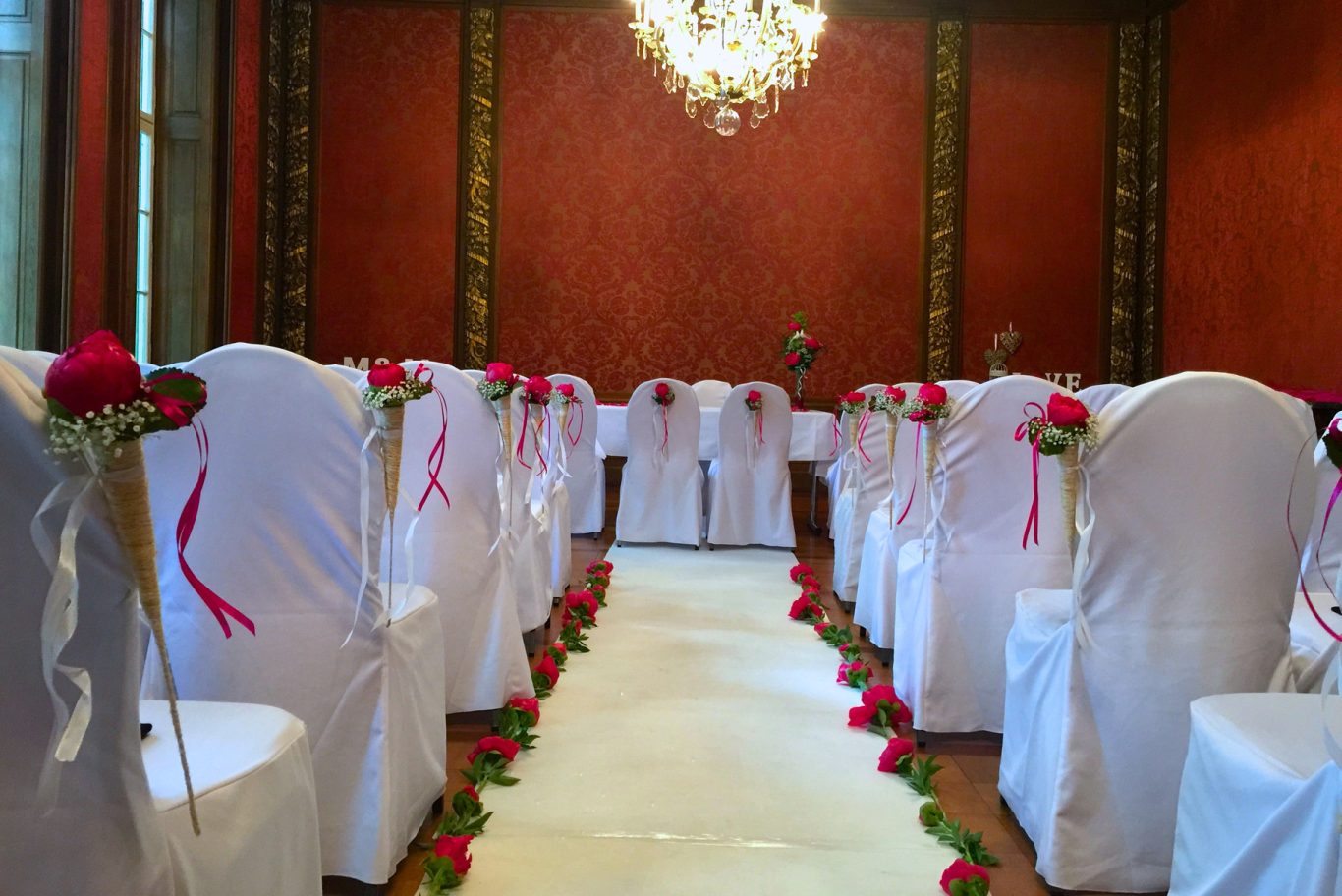 Diese Hochzeit verkörpert das klassische Ideal: rote Rosen, edle Perlen und das Brautpaar als Zentrum der Liebe.