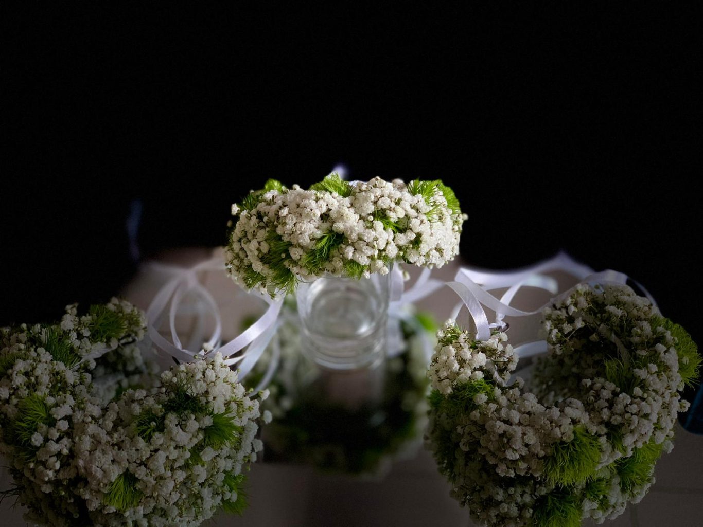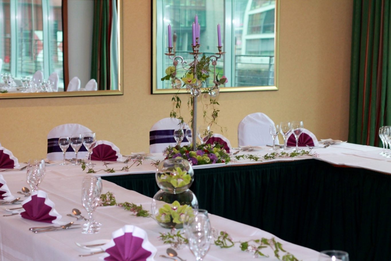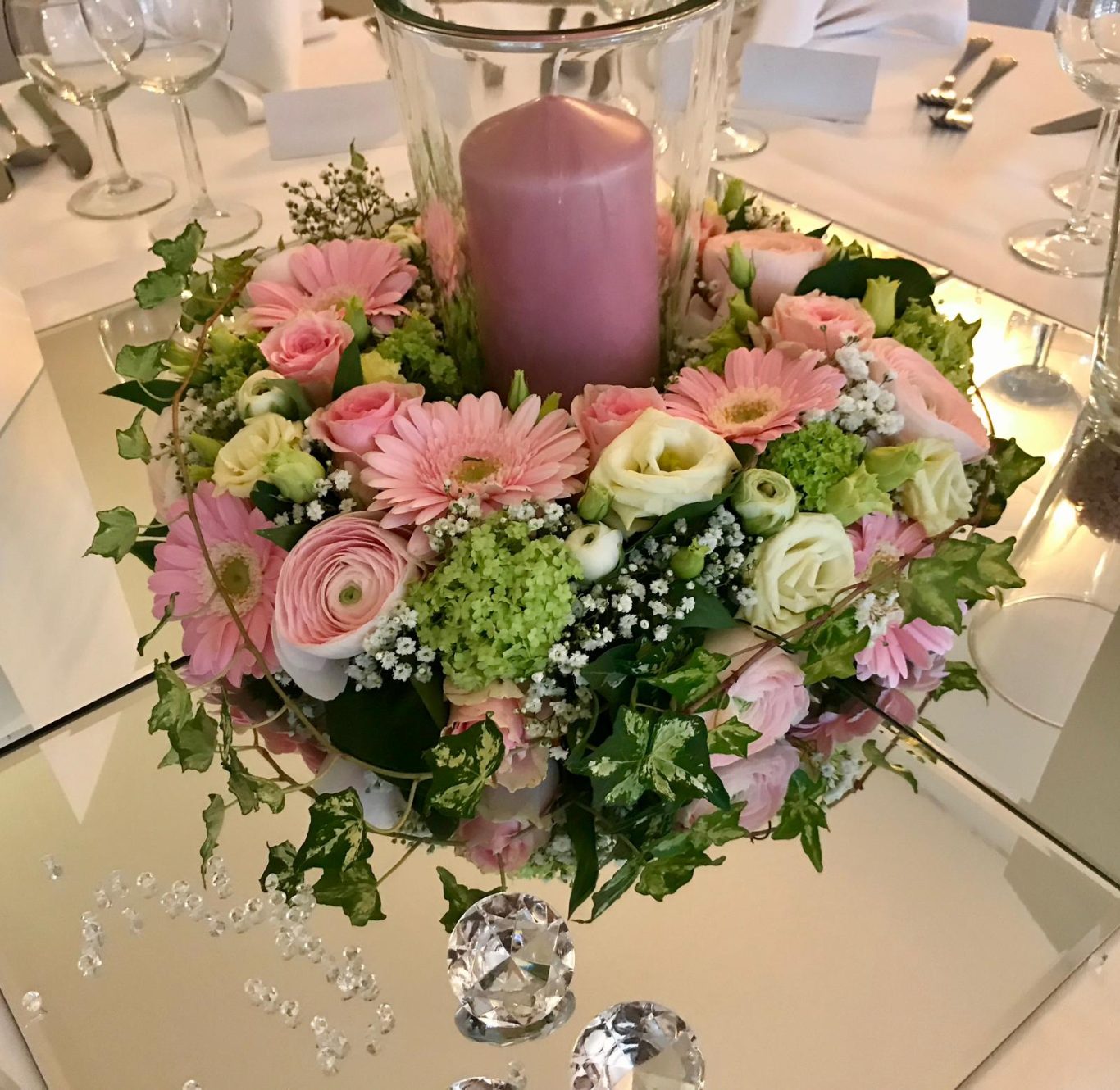 Der Kerzenleuchter wurde mit floralen Ranken und Blüten geschmückt, am Fuß ein üppiger Blütenkranz, der das Zentrum der Dekoration bildete. Hängende Kristallgefäße reflektierten das Licht und sorgten für ein schimmerndes Spiel über den Tischen.