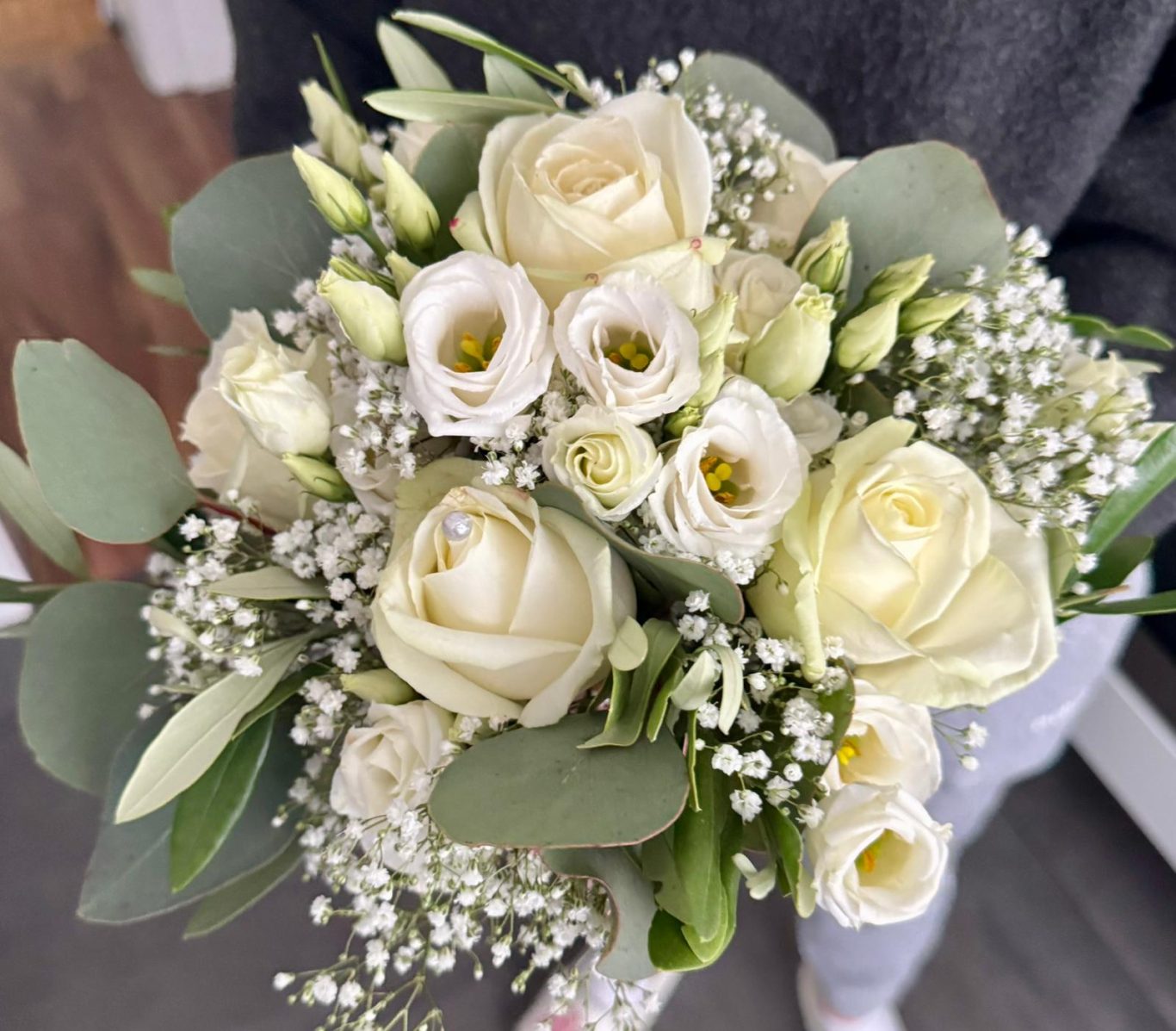 Der Brautstrauß, abgestimmt in Weiß, wurde durch florale Highlights wie Rosen, Alchemilla und Perlen veredelt. Passend dazu: liebevoll gestaltete Tischdekoration und harmonische Arrangements für den gesamten Tag.